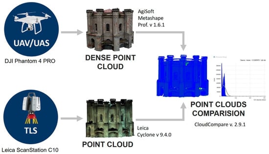 The comparison between 3D models helps to detect changes in the building through the identification of redundant or missing elements in one model. This methodology also allows evaluating the usability of the new surveying methods by comparing the accuracy of the obtained results with the traditionally used methods. This section presents a methodology of UAV and TLS models change assessment. It was made by a comparison between point clouds of the Water Tower building collected by UAV and TLS sensors. The processing workflow is presented in Figure 7.