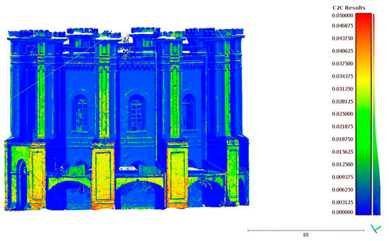 In order to assess the accuracy and effectiveness of the UAV acquisition method for smart tourism services, the analysis of the Water Tower building was conducted. The comparison of point clouds was performed with the use of the CloudCompare app (CloudCompare Development Team, 2019). Cloud Compare is an open-source software package designed specifically for point-cloud processing and contains significant mesh model/point cloud comparison tools.