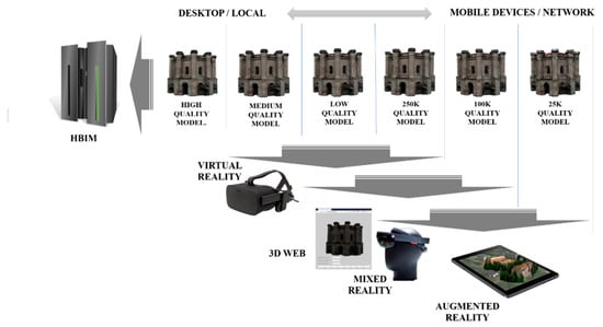 BIM is a complete solution that meets the expectations of professional users. It provides an interface for sharing information throughout the whole building life cycle. Currently, several commercial applications are available in the market. They offer advanced algorithms for creating, analyzing, and further visualizing building models [33]. There are many studies in the literature concerning the use of VR/AR/MR for the visualization of historical buildings [34]. However, they show the need to develop solutions that allow the use of 3D products also for cultural tourism and services for individual customers.