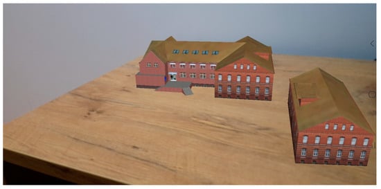 The AR application can visualize multiple models at the same time (Figure 18). This method was used to display two models of the same building to show its appearance in 1976 and 2002. The application offers additional functionalities, such as zooming, moving, and rotating the models. The gesture-based functionality helps to analyse existing differences and evaluate changes. The comparison shows that in 2002 a new part was added to the historic part of the building. A new entrance was also added, but the appearance of the building was maintained in the same style.