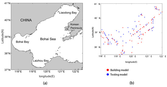 Location of Bohai Sea. (a) Study area; (b) the distribution of sampling points in study area, in which red points represent the sampling points of building model and blue points represent the sampling points of the testing model.