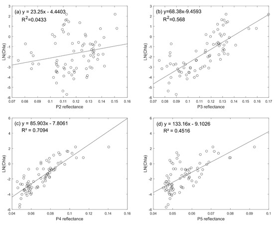 Correlation between band reflectance and sampled chlorophyll-a (Chla). (a–d): The linear relationship between the reflectance of band 2,3,4,5 and Chla concentration. The abscissa is the reflectance of a single band, and the ordinate is the natural logarithm of Chla (Ln(Chla)).