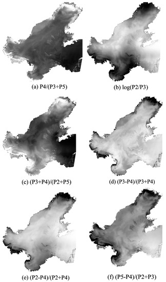 According to the correlation analysis in Table 3, six combinations with strong correlation, and large correlation coefficient, are selected for detailed analysis and interpretation. Figure 3 is the grayscale map corresponding to the combination of six bands. Different band combinations provide different information, and the degree of correlation with Chla concentration is also different.