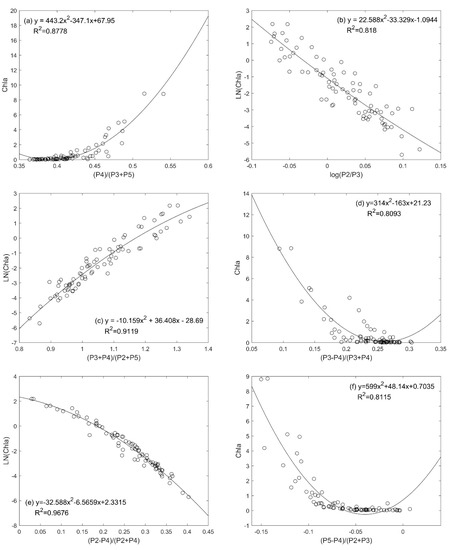 Curve fitting results of 6 models. The abscissa represents the combination ratio of band reflectivity. The ordinate in Figure 4b,c,e is the natural log of the measured data (Ln(Chla)), and the ordinate in Figure 4a,d,f is the measured data for Chla. (a): The correlation analysis between P4/(P3 + P5) band combination and Chla; (b): The correlation analysis between log(P2/P3) band combination and LN(Chla); (c): The correlation analysis between (P3 + P4)/(P2 + P5) band combination and LN(Chla); (d): The correlation analysis between (P3 – P4)/(P3 + P4) band combination and Chla; (e): The correlation analysis between (P2 − P4)/(P2 + P4) band combination and LN(Chla); (f): The correlation analysis between (P5 − P4)/(P2 + P3) band combination and Chla,