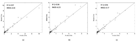 Compared measurements from two sources (e.g., field and remote-sensing ones) are necessary [53]. In total, 146 in situ measurements, of which 78 were used to establish the inversion formula, and the rest 68 were used to verify the retrieval results (Figure 5). In this paper, the correlation coefficients of modeled Chla and in situ Chla were analyzed to test the significance of the above formula and showed a significant result with R2 = 0.97, and the critical value of the correlation coefficient r0.05 = 0.374, r0.01 = 0.478, r > r0.01. This linear relationship is considered to be significant. In Figure 5a, the concentration range of Chla is 0–11µg/L, R2 is 0.97, and RMSE is 0.30. In Figure 5b, the correlation analysis between the sampling point and the simulation point with Chla concentration below 6 µg/L, the R2 is 0.96 and RMSE is 0.23. In Figure 5c, the correlation analysis between the sampling point and the simulation point with Chla concentration below 6 µg/L, the R2 is 0.96 and RMSE is 0.17.