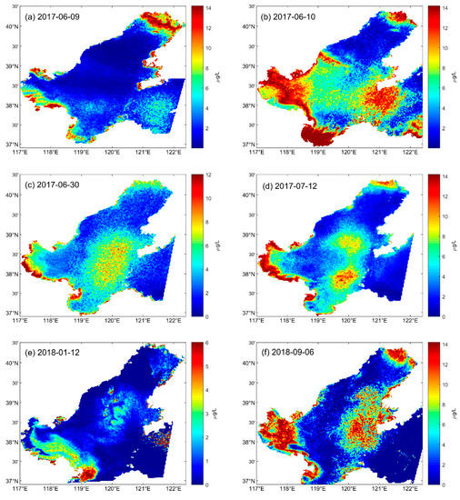 The distribution of Chla from June 2017 to September 2018 in the study area was retrieved (Figure 6) using the new model. Twenty PMS images obtained from the National Satellite Ocean Application Service (https://osdds.nsoas.org.cn) in China were analyzed and six PMS images were taken as examples (Figure 6). The Chla concentration in Bohai Sea is mainly below 14 µg/L and the high concentration areas are usually distributed in coastal waters, Laizhou Bay and the eastern Bohai Sea. The concentration of Chla in the Bohai Strait and northern Yellow Sea is relatively low with the value being around 5 µg/L. Furthermore, the average value of Chla concentration generally shows a trend high offshore, low in the distant sea, and the low value dominates most area of Bohai Sea. This is consistent with the actual situation and prior studies [4].