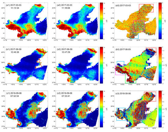 (a1)–(c1), (a2)–(c2): Chla concentration distribution at different times of the day. (a1)–(a2): the data at 11:12:34 and 11:18:08 on 3 March 2017, respectively; (b1)–(b2): the data at 12:46:36 and 12:47:29 on 9 June 2017, respectively; (c1)–(c2): the data at 07:32:34 and 07:33:41 on 6 September 2018, respectively; (a3)–(c3): changes in Chla concentration at two different times of the day. Colored squares: Chla change areas.