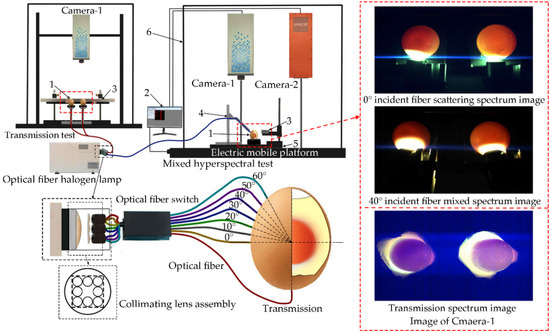 The scattering, transmission, and mixed hyperspectral images of eggs were collected using an optical fiber hyperspectral imaging system (Figure 2). The light source of the system was an optical fiber halogen lamp (LG-150B, wavelength range 400–2500 nm). The incident angle of the fiber could be adjusted to collect the corresponding types of hyperspectral images. The scattering hyperspectral images were collected as the incident angle was 0°. The mixed hyperspectral images were collected as the incident angles were 10°, 20°, 30°, 40°, 50°, and 60°, respectively. The transmission hyperspectral images were collected as the light of fiber was shot directly under the egg. As the angle was selected, the platform drove the sample to move continuously to obtain continuous one-dimensional images and real-time spectral information. Finally, we obtained a three-dimensional data cube including scattering, transmission, and mixed images and spectral information.