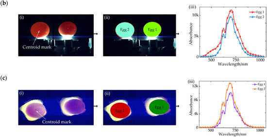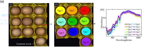 The freshness of eggs is related to their nutritional value. It is the most concerned index of processing companies and consumers, and an important index in transportation and processing [1]. It can be detected using traditional biochemical methods, but they are destructive, time-consuming, and inefficient. Therefore, non-destructive testing technology has significant advantages in the detection of egg freshness and has attracted wide attention. Currently, egg freshness is tested using non-destructive techniques of spectral analysis [2,3], dielectric property [4,5], electronic nose [6,7], machine vision [8,9], and hyperspectral testing [10,11,12]. Especially, machine vision method was established for egg freshness with an R (correlation coefficient) value of 0.8653 [8]. The prediction model was established using near-infrared spectroscopy with an R value of 0.879 [13]. The freshness model was established by testing the volatile concentration of eggs by electronic nose with a low efficiency, thus, it is not suitable for the dynamic testing of production line [7]. The egg freshness was tested using reflectance near-infrared hyperspectral with an R value of 0.879 [10], which could achieve rapid and non-destructive classification of egg freshness. However, the model precision could not be further improved due to the great influence of eggshell colors.