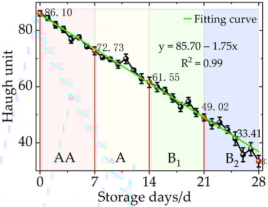 Five eggs were selected randomly every day to measure their Haugh units, and the units of 140 eggs were measured within 28 days. The units decrease linearly with time (Figure 4), and they fit well with Equation (3). Their detailed distribution is shown in Table 1.