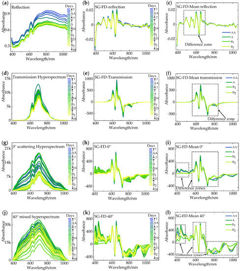 Savitsky–Golay first derivative (SG-FD) pretreatment. (a,d,g,j) The average hyperspectral of eggs per day from 1 to 28 days as incident light are reflection, transmission, 0° scattering, and 40° mixed spectra, respectively; (b,e,h,k) Corresponding spectra after SG-FD treatment; (c,f,i,l) The average spectra of Grade AA, A, B1, and B2 after SG-FD treatment, respectively.