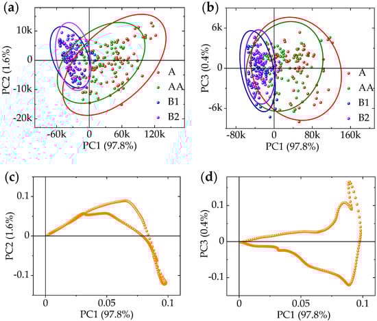The PCA analysis was based on preprocessed data. We performed a certain standardization and MC preprocess on the data before PCA. Figure 6a–d shows the PCA analysis results (PC1-PC2, PC1-PC3) in the case of 0° fiber light source based on SG preprocessing.