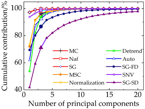 We take the various preprocessing methods of scattering hyperspectral at the 0° incident light as an example, calculate the cumulative contribution of the first 20 principal components (Figure 7). It shows that the first three principal components have the highest contribution. They were selected as feature component to extract the feature wavelengths.