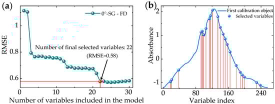 Number of variables in the 0° incident light model. (a) RMSE polyline; (b) Selected variables.