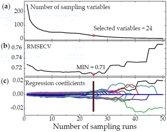 Competitive adaptive reweighted sampling (CARS) is based on the principle of “survival of the fittest” in Darwin’s theory of evolution. In order to reduce the dimensionality, partial least squares are used to select the spectral value with a larger regression coefficient, and the value with a smaller one is eliminated to select some feature wavelengths for representing the full spectral information. After this preprocessing, the dimensionality of the data is effectively reduced. In this study, we reduced the dimensionality of the preprocessed spectrum by CARS and sampled the eggs by using Monte Carlo. The sampling time of Monte Carlo was set to 100, and the PLS model was established by using five-fold cross validation. Subsequently, the 0° incident light was taken as an example to extract the process of the feature wavelengths after SG-FD preprocessing (Figure 9).