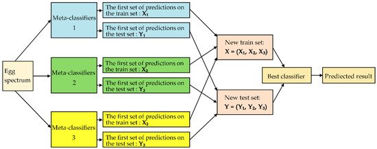 It was necessary to preprocess the original spectra due to the uneven intensity of light sources at different wavelengths and the influence of instrument noise. In this paper, the spectra were processed using ten preprocessing methods, including multiplicative scatter correction (MSC) [23], standardized normal variate (SNV) [24], normalization [25], autoscales [26], mean centering (MC) [27], moving average method (MA) [28], detrend fluctuation analysis (Detrend) [29], Savitsky–Golay smoothing (SG) [30], Savitsky–Golay first derivative (SG-FD) [31], and Savitsky–Golay second derivative (SG-SD) [32]. To reduce calculation and increase calculation speed, competitive adaptive reweighted sampling (CARS) [33], principal components analysis (PCA) [34], and successive projections algorithm (SPA) [35] are preferable to extract feature wavelengths to reduce the dimensionality. The preprocessed dataset was used to extract feature wavelengths and used as the final sample. Then, 71.43% of the samples were randomly selected as the training set, and the remaining 28.57% 0% as the test set. We compared the prediction of egg freshness using the following six models: support vector machine (SVM) [36], k-nearest neighbor (KNN) [37], random forest (RF) [38], Naive Bayes (NB) [39], discriminant analysis classifier (DAC) [40], and latent Dirichlet allocation (LDA) [41]. In order to further improve the accuracy and the generalization ability of the egg freshness classification model, multiple weak classifiers were merged into a strong classifier by stacking ensemble learning [42].