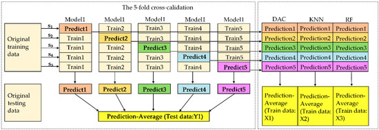Therefore, in this experiment, three classifiers with the best model accuracy are selected to establish three meta-classifiers as the input of the second layer. The training and test set are predicted based on the idea of five-fold cross validation in each meta-classifier, in order to prevent data leakage (Figure 11). Finally, the new training and test set are used to establish the egg freshness classification model based on SEL.