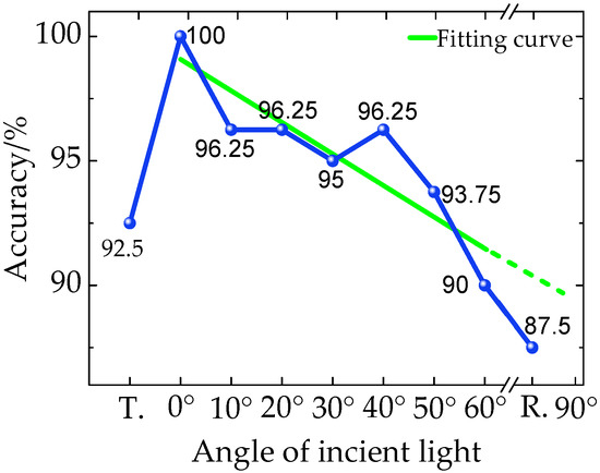The highest accuracy of the best model is different under different incident angles (Figure 12). The accuracy at the 0° incident light (100%) is the highest. Its accuracy is almost linearly reduced from 100% to 90% as the incident angle increases from 0° to 60°. The accuracy of the transmission and reflection incident model are 92.5% and 87.5%, respectively. These indicate that the incident angle has an important influence on the accuracy of a model.