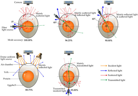 Different incident angles cause different information to be contained in the light collected by the camera, resulting in different accuracy of egg freshness. The freshness is closely related to the internal composition of an egg, yolk index [43], the pH of protein [1], and air chamber index [44]. The spectra collected about the more internal information of an egg is the precondition for establishing a model with higher accuracy. The analysis of the light propagation paths inside an egg helps us to understand the information contained in the image at different incident angles. For different incident modes, the propagation paths of light through an egg are different, and therefore the information collected is also different (Figure 13).