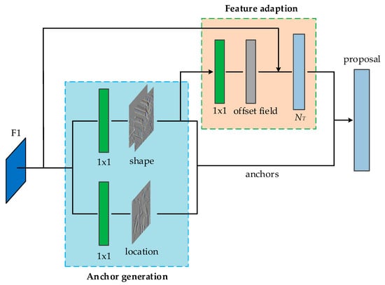 This module directly integrates the shape information of the anchor into the feature map, so that the newly obtained feature map can adapt to the shape of each position anchor. Using a 3 × 3 deformable convolution to correct the original feature map, the offset of the deformable convolution is obtained through a 1 × 1 conv through the w and h of the anchor. Through this operation, the purpose of making the effective range of the feature closer to the shape of the anchor is achieved, and different positions of the same conv can also represent anchors of different shapes and sizes. The formula of feature adaption is as follows: