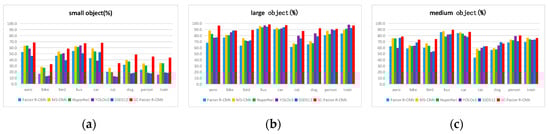 Figure 7, with an mP evaluation index, shows the detection of small, medium, and large objects in the test set of the 07 + 12 dataset by various detection algorithms, that is, the detection results of different types and scale objects in the test set by each detection algorithm. Figure 7, especially Figure 7a, shows HyperNet, an algorithm for feature fusion from multiple feature layers, and MS-CNN, the multi-scale detection algorithm and the method proposed in this paper. Their comprehensive detection performance for small object detection is better than other algorithms and other networks. With the cooperation of the context feature extraction module and the skip pooling method, the detection performance of SC-Faster R-CNN for small objects was greatly improved on the basis of Faster R-CNN. It can be seen in Figure 7b,c that as the object scale becomes larger, the detection performance of each algorithm gradually tends to approximate.
