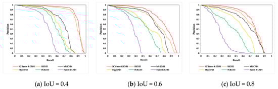 In order to more intuitively reflect the detection performance of SC-Faster R-CNN, this paper discusses that when the threshold of IoU is 0.4, 0.6, and 0.8, various detection algorithms are based on the 07 + 12 dataset to obtain precision-recall (PR) curve images. According to Figure 8, it can be concluded that with increased IoU threshold, the improved SC-Faster R-CNN based on the Faster R-CNN framework highlights the state-of-the-art detection performance. The results of the PR curve images are consistent with the conclusion of Table 4.