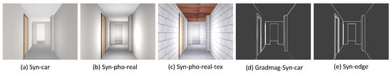 Syn-car images (Figure 2a) were generated using a rendering model that roughly traces the path of the light. Syn-pho-real (Figure 2b) images were generated using an advanced light tracing model that follows the physical rules of light scattering and reflection. Syn-pho-real-tex (Figure 2c) images are also generated using the same light tracing model as Syn-pho-real. However, these images contain the synthetic texture of objects like brick and carpet texture on the walls and floor, respectively. Gradmag-Syn-car (Figure 2d) images are derived from Syn-car images by taking gradient magnitude of the images. Edge render images (Figure 2e) were generated by rendering only the edges of the 3D indoor model in the Field-of-View (FoV) of the virtual camera. More details of the synthetic dataset is present in Section 4.3.