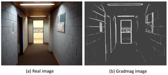 Real image dataset: A total number of 950 images having a resolution of were captured by a smartphone camera having a FoV approximately equal to 56. The focus of the camera was fixed to avoid any out-of-focus images, and the exposure of the images was fixed to limit underexposed images. The camera was calibrated to estimate the intrinsic parameters that were used to design the virtual camera. However, the distortion of the images was not modelled for the virtual images. The images were acquired at a constant rate of 30 frames per second. The edge images of the real images were generated by taking the gradmag of the images and suppressing the weak edges below a threshold. A sample real image and its corresponding gradmag image are shown show in Figure 3a,b, respectively.