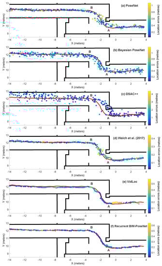The predictions of (a) PoseNet [1], (b) Bayesian PoseNet [2], (c) differentiable RANSAC (DSAC)++ [16], (d) Walch et al. [4], (e) VidLoc [20], (f) Recurrent building information model (BIM)-PoseNet fine-tuned and tested using a sequence of ten real images. The colour represents the magnitude of error of each point, and the red line denotes the ground-truth trajectory.