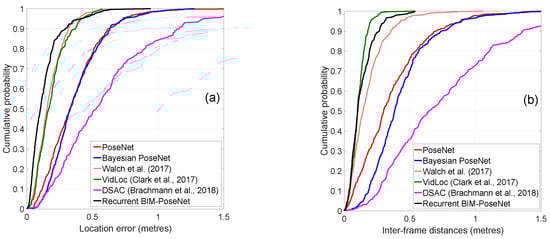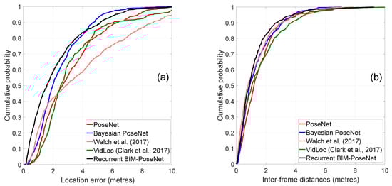 Figure 10 shows the CDF plots of the localisation errors and the inter-frame distances of the different approaches. The errors and the inter-frame distances are calculated as explained in Experiment 1. It is evident that Recurrent BIM-PoseNet outperforms all the other approaches in terms of precision. The inter-frame distances of all the approaches are comparable; however, only a slight improvement is identified for Recurrent BIM-PoseNet.