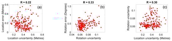 where denotes the correlation of estimated location uncertainties vs. location errors, denotes the correlation of the estimated rotation uncertainties vs. rotation errors and denotes the correlation of the estimated location uncertainties vs. estimated rotation uncertainties. is the vector containing the estimated location uncertainties, is the vector containing the estimated rotation uncertainties, is the vector containing the location errors and is the vector containing the rotation errors. , , and denote the standard deviations of , , and , respectively, and represents the covariance between two random variables.