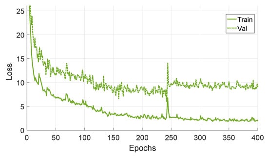 Figure 7 shows the training and validation losses for network fine-tuned and validated with real image sequences, with a window of 10 images. The results indicate that the validation loss did not improve after 250 epochs, and the best network was selected as the one having the least validation loss.