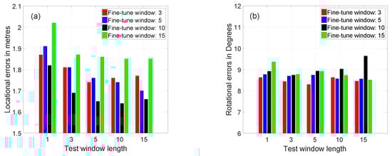 The fine-tuned networks can generalise better on a longer window of test image sequences than when it was fine-tuned. For instance, consider the network that was fine-tuned on a window of three synthetic images, which makes good predictions of the location and rotation of the real image sequences having a window length of 5, 10 and 15 images. The performance of the networks to predict the location of image sequences having a shorter window length is worse, compared to testing with the same window length. For example, consider the network fine-tuned using a window of ten images, where its performance for predicting the location of the sequence of images having a length of 1 and three images is worse, compared to testing it using a window of ten image sequences. In contrast, this trend is not valid for rotational errors, where the networks can make sound predictions of rotation for a longer and shorter window of image sequences than when it was fine-tuned. Figure 8b shows that there is a slight decrease in the rotation errors with the increase in the length of the window of the image sequence.