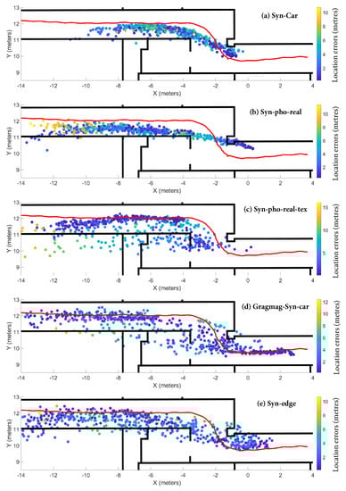 Estimated camera poses by the Recurrent BIM-PoseNet fine-tuned using (a) Syn-car, (b) Syn-pho-real, (c) Syn-pho-real-tex, (d) Gradmag-Syn-car, (e) Syn-edge. Networks fine-tuned with Syn-Car, Syn-pho-real and Syn-pho-real-tex images were tested with real images, whereas networks fine-tuned with Gradmag-Syn-car and Syn-edge were tested with gradmag of real images.