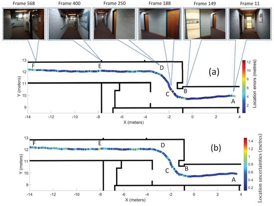 Figure 11a shows the distribution of the errors and some of the frames that resulted in large errors along the trajectory (fine-tuned on Gradmag-Syn-car dataset), to identify error-prone areas. Table 3 shows the errors and estimated uncertainties for these frames. The large errors are likely the result of poor geometry of the scene, where the doors are far away from the camera, for example, near Point A. Other error sources include the motion blur that results in larger errors for the Points B, C and D of the trajectory. Additionally, the objects that are present in the images, but not in the 3D indoor model, such as the notice boards, poster and light flares (seen in Point E and F), are the other sources of errors. The errors near Point D in Figure 11a are reduced for Recurrent BIM-PoseNet (up to 6 m) as compared to [7] (up to 8 m) and [8] (up to 10 m).