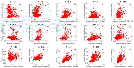 where, and denote the uncertainty of camera location and rotation, respectively for the frame, and C denotes the covariance matrix. Subsequently, the correlation factor R [8] is defined to quantify the correlation of the estimated localisation uncertainty and localisation errors in the following equations: