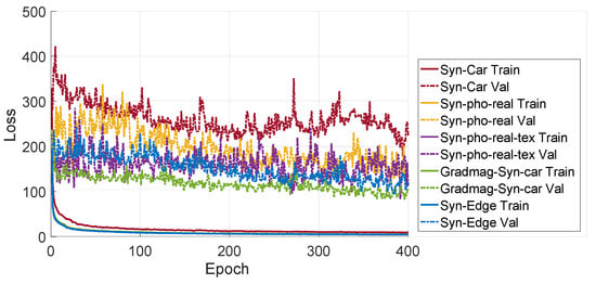 Figure 9 shows the estimated trajectories by Recurrent BIM-PoseNet fine-tuned with different synthetic image datasets. It is observed that the distribution of the estimated points for the network fine-tuned with Gradmag-Syn-car images (Figure 9d) is more consistent with the ground-truth, and a similar trend is noticed for the Syn-edge images (Figure 9e). Additionally, the bias or shift in the location of the estimated points reported in [7,8] is greatly reduced, especially for the Gradmag-Syn-car dataset. The predictions for the network fine-tuned with Syn-Car, Syn-pho-real and Syn-pho-real-tex are skewed and deviate from the ground-truth.