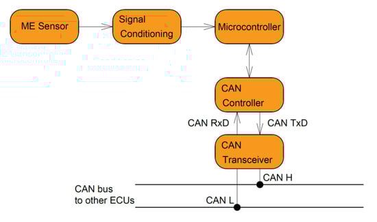 The ME position sensor without signal processing can also be applied as a car CKP sensor, which has been proposed in other papers. The difficulty of integrating this sensor into the car’s electronics is the main disadvantage of such a design. Processing of signals received from the ME element with further output to the CAN bus, and then to the car’s ECU (electronic control unit) for solving this problem, is proposed.