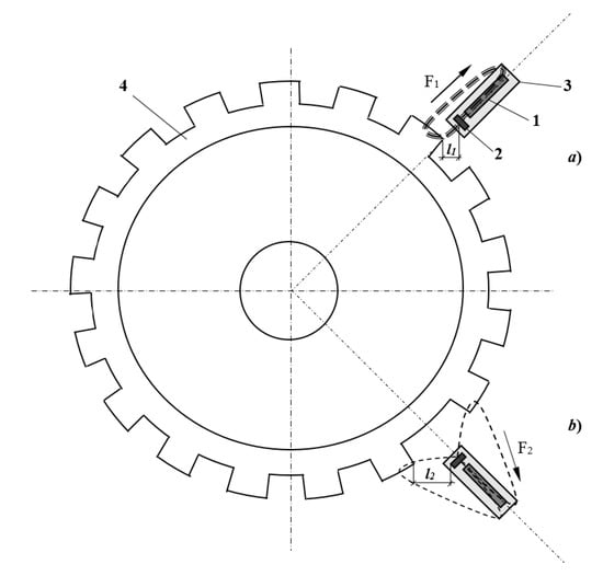 Principle of the operation of the ME CKP. (a) ME sensor is located above the tooth; (b) ME sensor is located between the teeth in the gap.