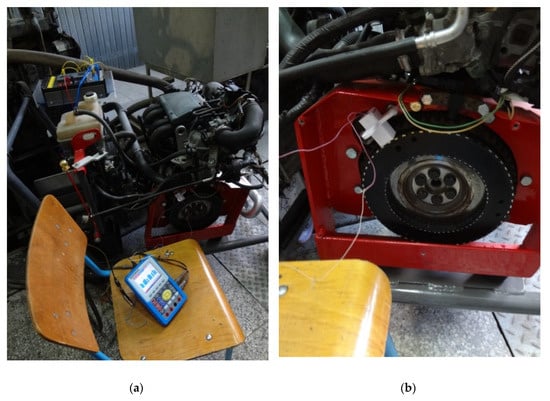 The measurements were carried out using the stand shown in Figure 6. The measuring stand is the installation of a car engine with the ability to connect various nodes; for example, a crankshaft position sensor (Figure 6a).