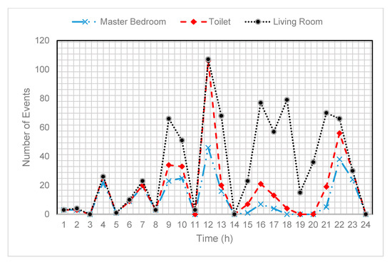 Figure 6, we identify a specific activity of the resident in different time slots of a day. This analysis shows that the long-term data prediction can be utilized for finding the time sequence information of the resident while performing a specific activity. Therefore, this information can be utilized to determine the particular sensors of whom residual energy will be drained quickly. During the 24 h of time, we have noticed that during the daytime, the energy consumption of some sensors, such as a morning and evening time in the kitchen and toilet, is high compared to other times of the day. It also depends on the nature of the dataset; for instance, the users in both datasets remain at home instead of going outside. Therefore, we can see the energy consumption of the sensors is high in the daytime.