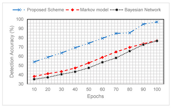 As we can see, the proposed EEA-SDC performs better in achieving significantly high detection accuracy compared to the Markov and Bayesian models. The Bayesian and Markov result in minimum detection accuracy because the former works on the conditional probabilities, and the latter works over states. Both of them have limitations, such as Markov performs lower in the case of unlabeled data because it relays on the present state of the information. Besides, the Bayesian networks work better whenever the dependency of the events on each other is clearly graphed as directed acyclic graphs. Therefore, the main idea of the Bayesian networks is to find the conditional probabilities of an event A, given the probability of event B. Interested readers can refer to [