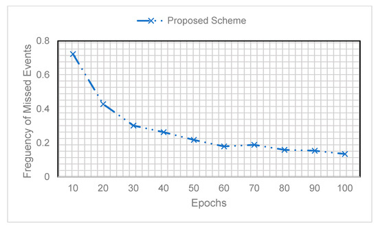 Figure 8 shows the frequency of the missed events when validating our model. It is noted that the frequency of missing events in the initial episodes is very high. Afterward, it is noticed that with the greater number of epochs, the frequency of missed events is significantly decreased. The reason for a smaller number of missing events in the final episodes is the parallel execution of BiLSTM and Q-Learning algorithms during the training process. The minimum number of missing events significantly increases detection accuracy.