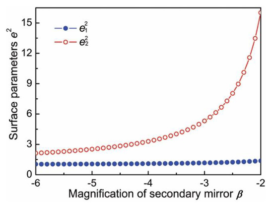 When αmax = 0.43 was substituted in Equations (16) and (17), the variation of e12 and e22 versus β value was simulated and shown in Figure 1. The results showed that, e22 changed rapidly and e12 changed slowly with β. This shows that the β value had little influence on the processing tolerance of the primary mirror, but presented a stronger impact on the processing tolerance of the secondary mirror. The smaller e22 value corresponded to the tighter machining tolerance of the secondary mirror. Therefore, β value was finally determined as −5 based on the comprehensive consideration of tolerance requirements, design difficulty and design experience.