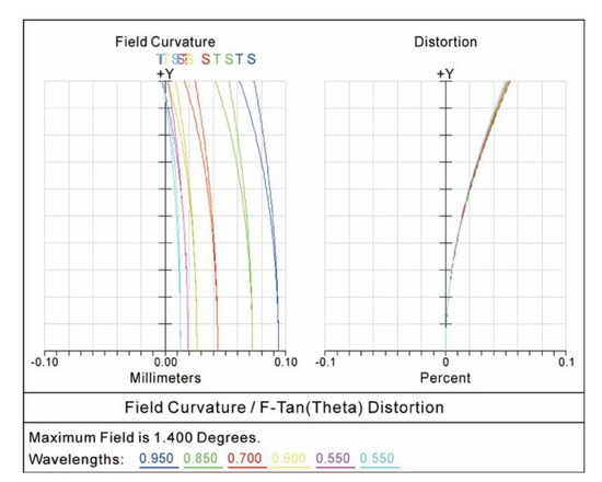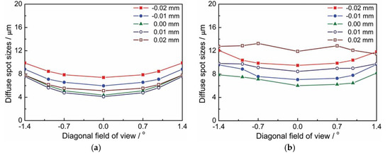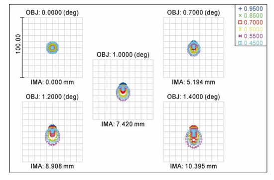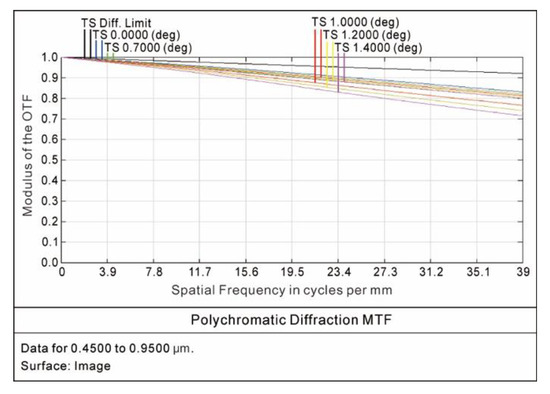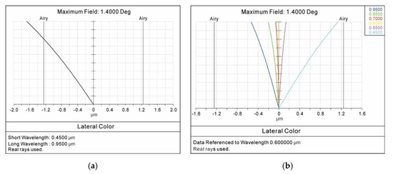 In the whole diagonal field of view from −1.4° to +1.4°, Figure 6a shows the lateral color curve between the short wavelength of 450 nm and the long wavelength of 950 nm. Figure 6b shows the lateral color curves between different wavelengths (450–950 nm) and the center wavelength of 600 nm. The results showed that the maximum of the lateral color was −1.67 μm. The design specification of the lateral color that was less than 2 μm was fully demonstrated.