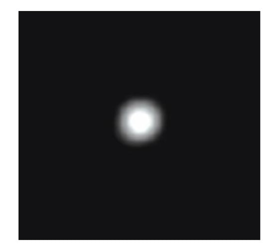 If the template is in decimal form, it needs to be normalized and the value of the upper left corner of the template is normalized to 1. Then, the center of the Gaussian template needs to align with the image matrix in order to be processed, then multiplied with the corresponding elements and added together. Finally, set “0” where there is no element. Each element is calculated separately, and the output matrix obtained is the result of Gaussian filtering. The images of the diffuse spot collected by the COS prototype before and after noise reduction are shown in Figure 10a,b, respectively. Gaussian filtering is a frequency domain processing method. When analyzing the frequency characteristics of an image signal, the edges, jumps and grain noise of the image usually represent the high-frequency components of the image signal, while the large background area represents the low-frequency components of the image signal. Filtering the high-frequency components can remove the background noise, so that the image is smooth. Therefore, it can be seen from Figure 10a,b that the images of the diffuse spots before filtering looked like ellipses and then became circles. Figure 11 shows the image of the diffuse spot from the COS prototype measured at a defocus amount of 0.02 mm and a field of view of 0°. The strong amount of roundness of the diffuse spot indicated that the COS prototype designed for the 15-magnitude star sensor was less affected by distortion and color aberration.
