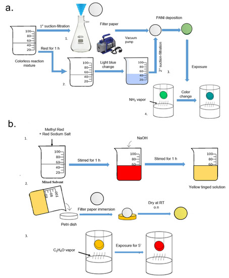 Schematic NH3 (a) and C2H4O (b) paper sensor fabrication procedure: (a) 1. Half of the colorless reaction mixture was immediately suction-filtered into a silicon funnel where a filter paper (white circle) was placed. 2. The remaining part of the solution was left to stand for 1 h. During this time, the solution turned light blue. 3. The solution was filtered (II suction-filtration) through the filter paper, in order to induce the polyaniline (PANI) deposition. After several washes and air flow drying, the formation of emerald green filter paper (green circle) was completed. 4. The emeraldine green filter paper turned into a blue emeraldine base (blue circle) as a result of NH3 vapor exposure. (b) 1. The methyl red and methyl red sodium Salt were added to the mixture. The color solution turned into red-orange and was stirred for 1 h. After this time, NaOH was added, resulting in a color change to yellow. The solution was left to stand for 1 h. 2. The solution was transferred in a petri dish and the filter paper was immersed in it for 1 h. The filter paper was dried overnight in the dark at room temperature. The formation of methyl red filter paper (yellow circle) was completed. 3. The methyl red filter paper turned into red (red circle) as a result of C2H4O vapor exposure.