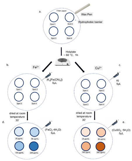 A small volume (5 μL) of Fe2+ and Cu2+ assay reagents ((K3[Fe(CN)6]) and KI) was spotted by drop-casting on paper circular dots using a micropipette and allowed to dry at the room temperature for 3 h. Five microliters of each standard solution was added to the corresponding labeled spots of the PAD. The Fe2+ of the standard solutions reacted with the K3[Fe(CN)6] generating blue colored complex in the detection zones. Instead, the Cu2+, reacting with KI, produced a red-brown compound. The intensity of the color was proportional to the standard solution concentration. A schematic representation of the described process was represented in Figure 2.