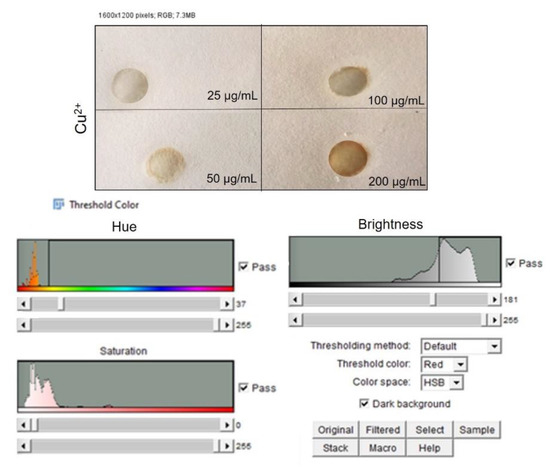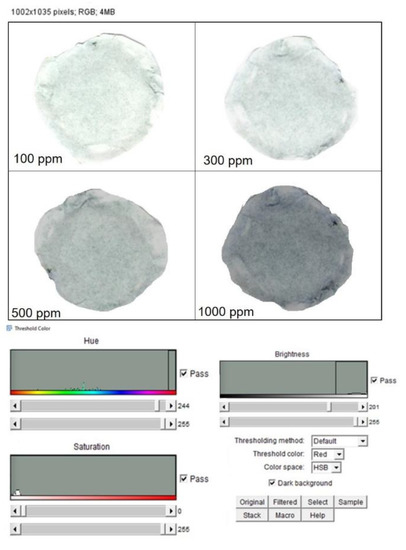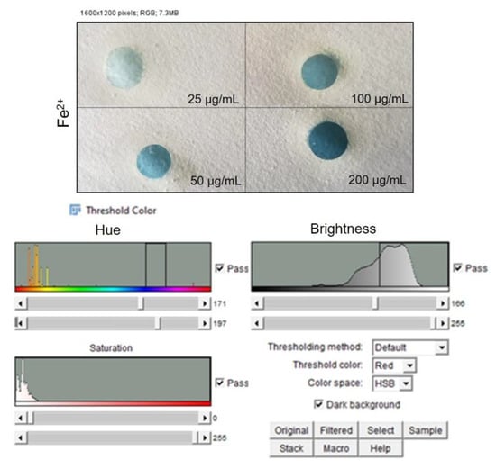 Once the color changes were achieved due to the chemical interaction with the different hazardous compounds, the corresponding PADs images were captured using scanner Samsung SCX-3400 with a resolution of 300 dpi. Then, the images were stored in JPEG format and analyzed in RGB format with the open-source software, ImageJ [46]. An adjustment of the color threshold was applied to each image to filter out all colors that were not correlated to the colored complex to be detected during the analysis. For instance, the Fe2+ color adjustment was applied to delete all colors which was not in the blue range from the analysis spectrum. The color adjustment was set as follows: