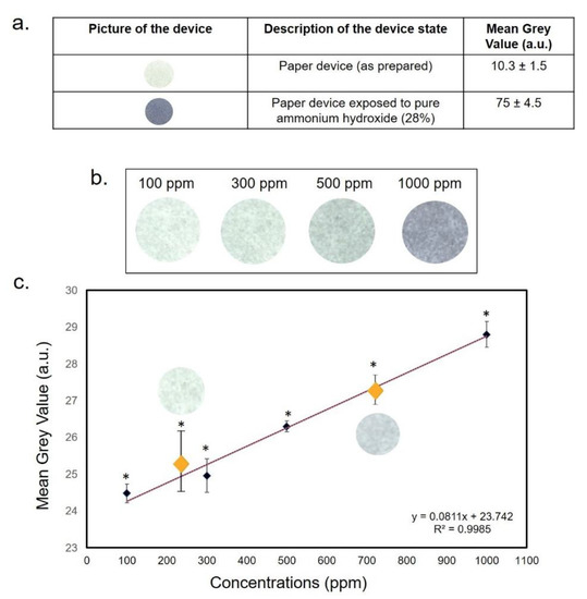 (a) Mean Gray Value (MGV) values of PAD as prepared and after the exposure to pure NH3 (28%). (b) color change after NH3 exposure. (c) Interpolation of NH3 intermediate values (200 and 750 ppm). Data reported were the average of three independent experiments ± SD. The difference between the as-prepared paper and colored papers was considered statistically significant performing a Student’s t-test with p < 0.05 (<0.05 *).